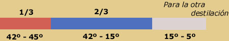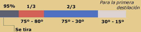 Las primeras tomas están alrededor de los 75º- 80º y se destilará hasta los 32º aprox, lo que salga posteriormente se destinará para otra 1ª destilación.